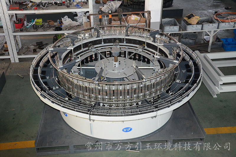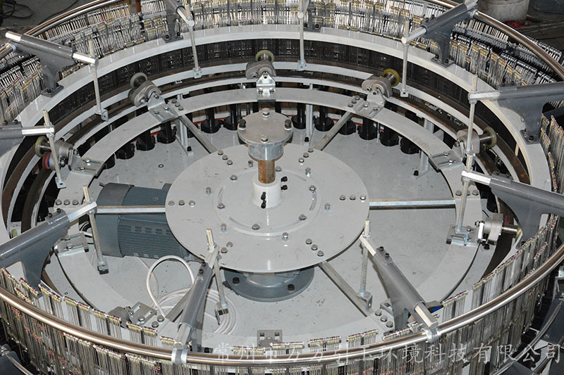 圓織機的經(jīng)紗架上有有許多紗錠,依據(jù)編織布幅寬和扁絲寬度,使用規(guī)定范圍數(shù)量的經(jīng)紗.經(jīng)紗進入圓織機前,由經(jīng)紗的棕框?qū)?jīng)紗進行交叉開口,緯紗梭子在交叉開口中作圓周運動穿過經(jīng)紗,編織成筒布. 一臺圓織機有幾把梭子,就有幾條緯紗同時織入.對于平織布,可用平織機,片梭織機,噴水織機編織.